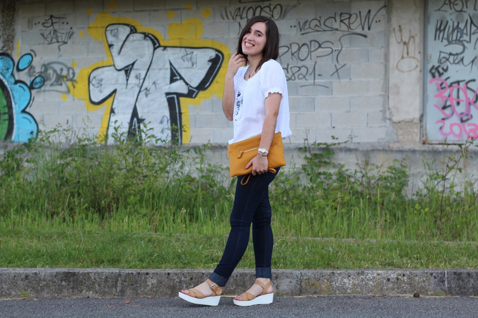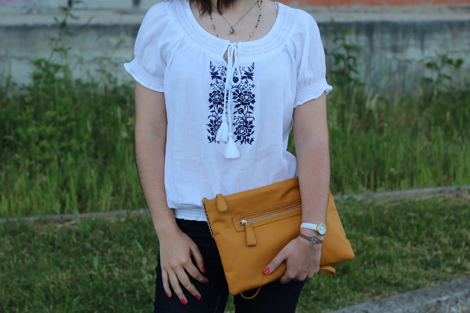 Blusas como a deste look têm sido as minhas melhores amigas nestes últimos dias quentes. São super frescas e confortáveis; e esta, em particular, vem de uma linha boho que eu adoro! Parece que a tendência está mesmo a conquistar-me, principalmente no que toca aos brancos e cores suaves. Apostei no amarelo da clutch para dar mais cor (e calor) ao conjunto, assim como, nas minhas novas plataformas, por serem tão práticas e leves. Não esqueci os colares e anéis em tons de dourado nem a pulseira em couro da Shaggy Handmade (falei aqui!), para os últimos detalhes.
