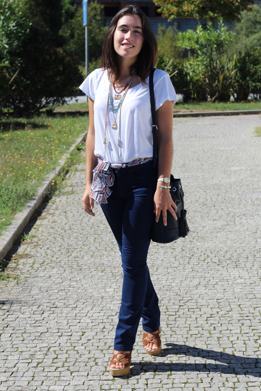 Porém, se me dão licença, quero chamar a vossa atenção para os jeans deste conjunto... flare! Atirei-me de cabeça e decidi experimentar este modelito. Conclusão? Não podia ter adorado mais! É verdade que só consigo imaginar-me em flare jeans usando salto alto, no entanto, considero a "boca de sino" super elegante, criando mesmo uma silhueta bastante agradável! Acrescentei-lhes um lenço na cinta, uma vez que estava a usar uma simples t-shirt branca, e voilá. Senti-me mesmo bem neste look! Bom fim-de-semana!!