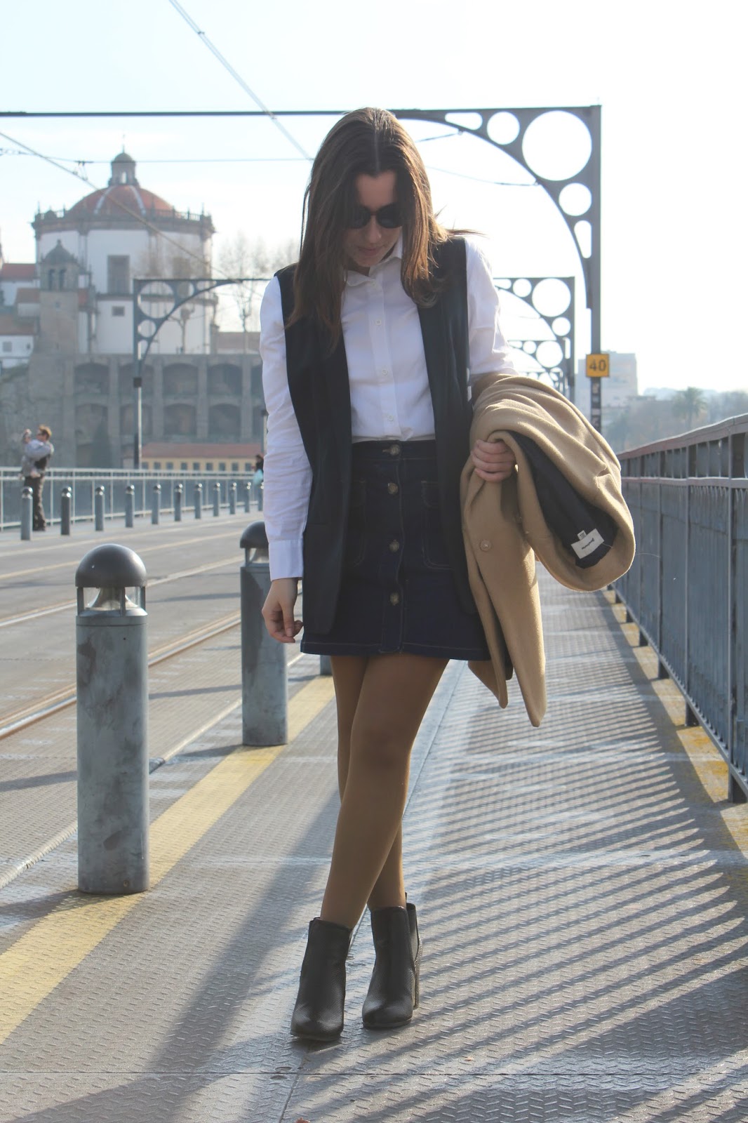 Como o dia foi passado na rua, sabia que um agasalho era essencial; é aqui que entra o meu camel coat que já não usava desde o último Inverno! Também aproveitei a ocasião para experimentar o que há muito tentava idealizar: o colete sobre a saia de ganga, que vem dar um toque bem mais casual ao restante look. Os botins snakeskin foram uma prendinha de mim para mim, que em breve vos mostrarei aqui (não sei se conseguem reparar, mas têm um detalhe dourado no salto que eu adoro!).