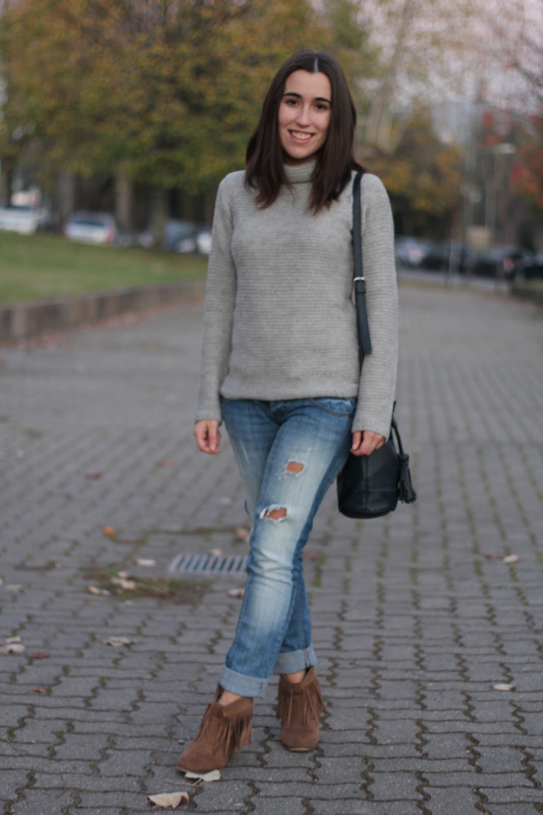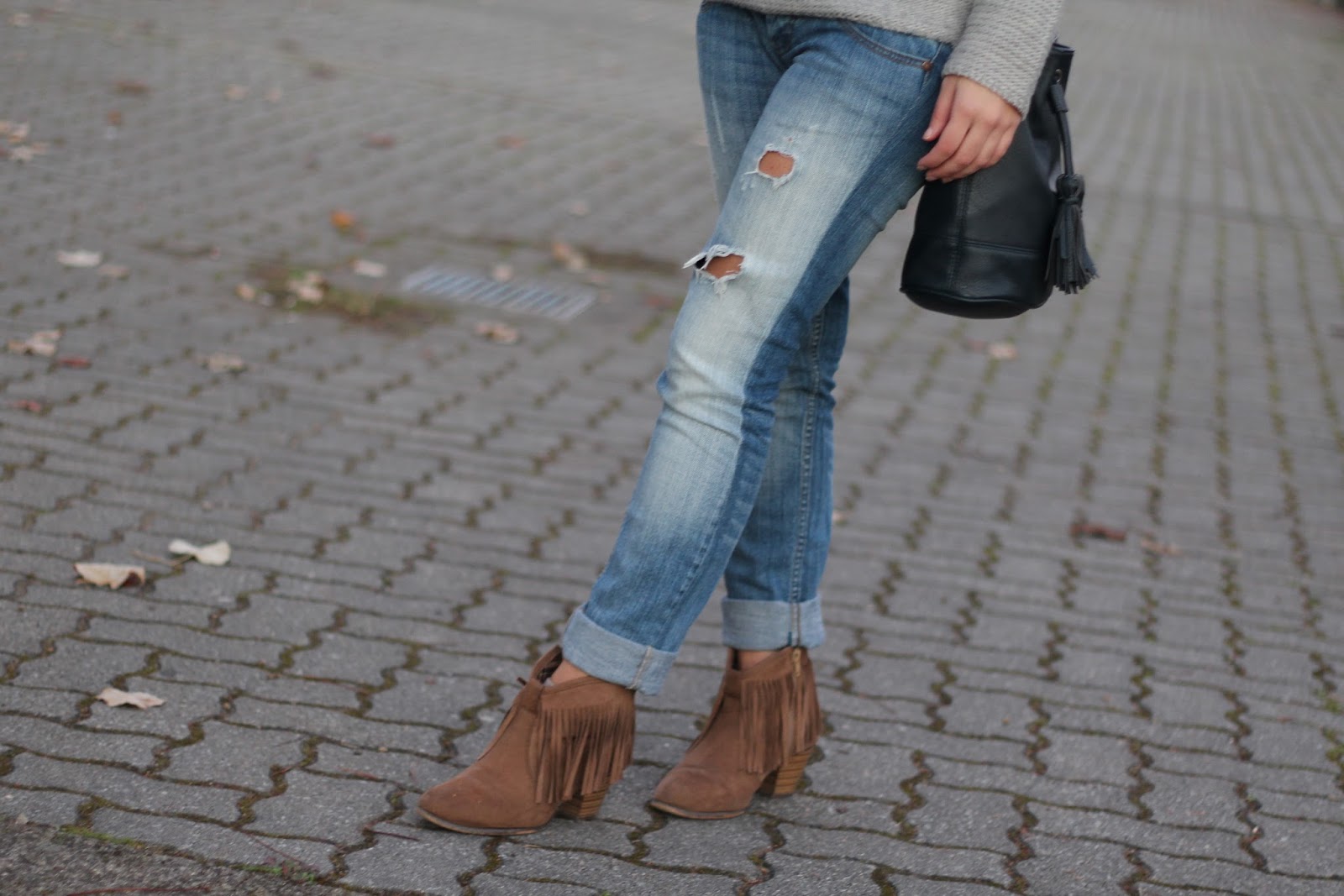 Quem me segue no snapchat (e quem não segue, vai passar a seguir! hihi >> ruteritamaia) sabe que, recentemente, recuperei estes jeans super velhinhos do armário e lhes dei alguns retoques, para os poder usar de novo. Aqui estão eles, num mood bem descontraído, acompanhados pelas minhas beloved fringed booties e por uma camisola de lã.